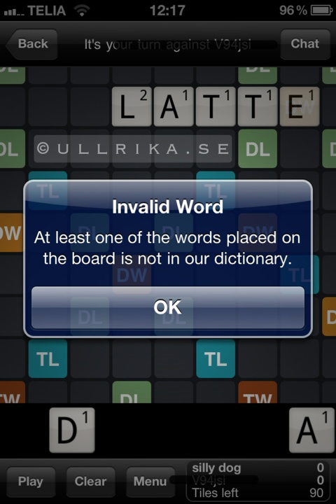 Och då är ändå den stricta mer tillåtande än riktig scrabbleordlista…. Du får skriva till Horace och föreslå ordet 🙂 Svara