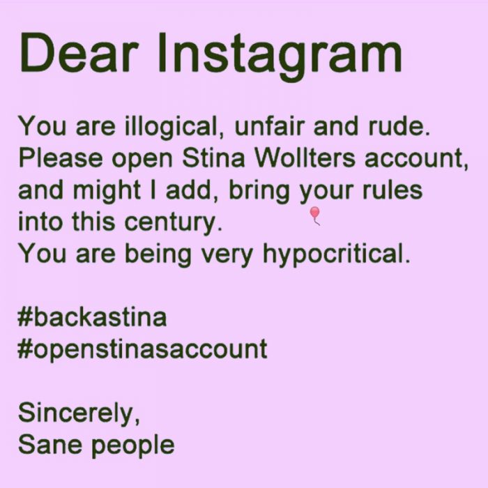 Det är för jävligt. Glädjespridaren, feministen och konstnären Stina Wollters instagramkonto har på helt bedrövliga grunder blivit avstängt. Jag blev så förtvivlat och hopplöst förbannad när jag läste nyheten.