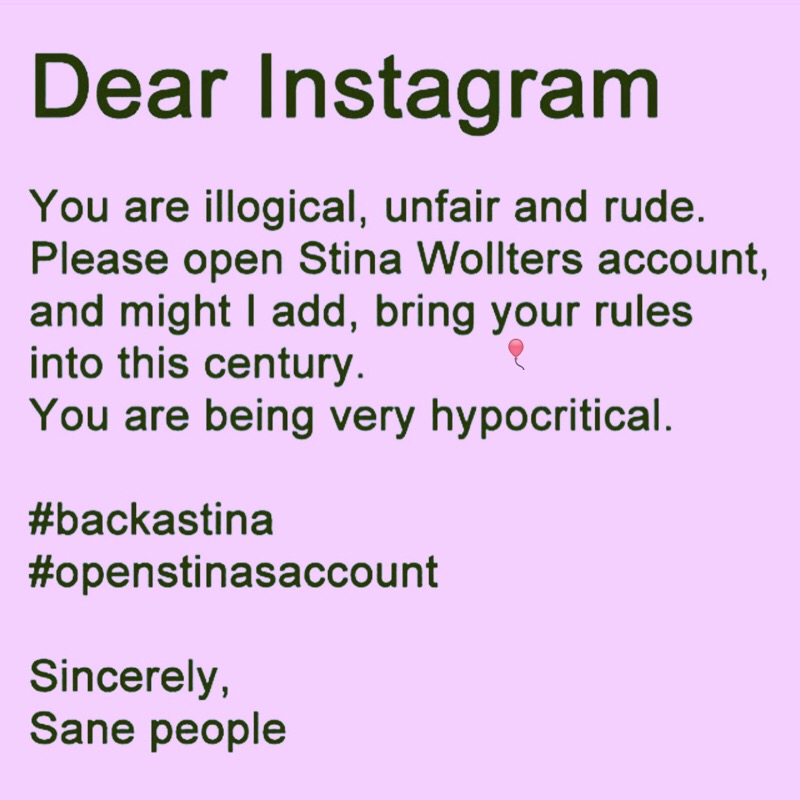 Nu hoppas jag att Instagram tar sitt förnuft till fånga. Vi vill ha Stinas konto tillbaka. Vi SKA ha Stinas konto tillbaka. Fan vore det väl annars.