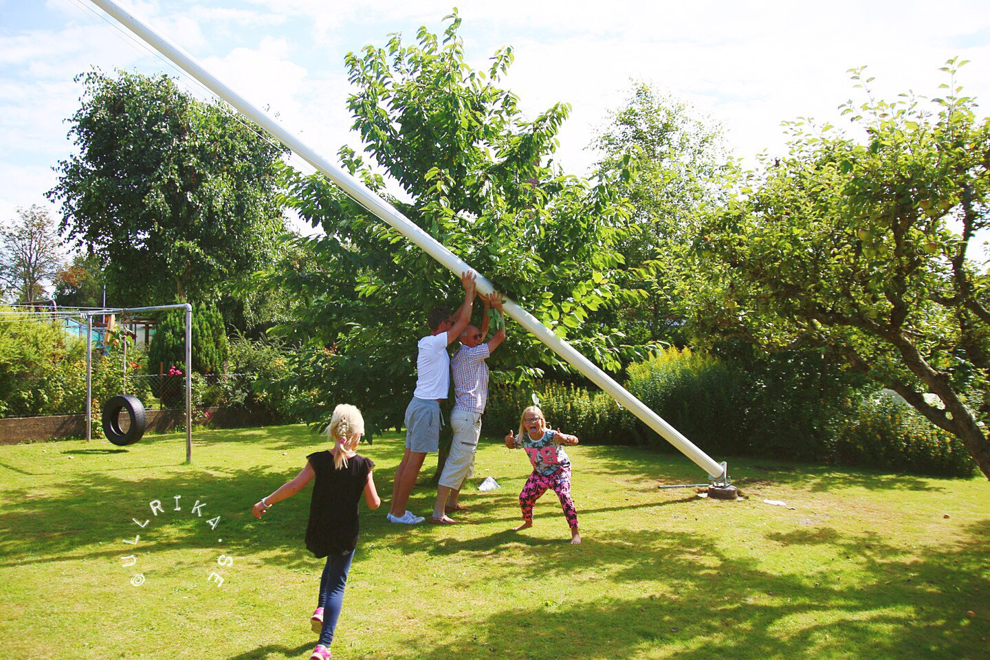 Fundamentet gjöts tidigare i veckan med hjälp av hyrd tombola och min fina kollega (lär återkomma till detta!) och aldrig har Morkullan 6 så ståtligt kunnat representera sitt land! Utan att va ett dugg patriotisk på annat än rent sunda grunder tycker jag om när vår flagga vajar majestätiskt och vackert mot en blå himmel. Nu kan också vi! – fast den första flaggan hade trådfel och fick köras å bytas, sen blev det hysteriskt vindstilla (vi var alla i chock, ett historiskt ögonblick på västkusten) men sen! Sen blåste en bris och himlen sprack upp ett leende och att vi struntat i att pressa flaggan slät syntes inte tolv meter upp i luften 😀