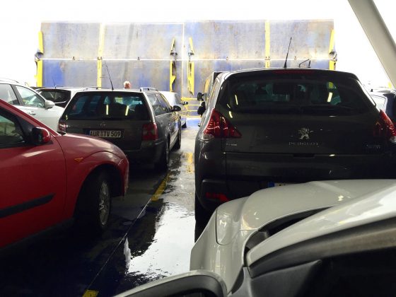 Tyckte sen att vi som tredje bil på “rätt” sida i förhållande till mannen i Stenalines reflexväst stod väldans bra till för att få komma av fort, men vad händer. Jajamen. Haveri på bilen längst fram… ååååh!!! 🙁 Det blev till att lägga i R och krångla sig ut – inga problem för mig men snubben framför såg lite ängslig ut att manövrera bakåt – och som typ sist kom vi av 🙂 Nåväl. “Sämre kunde en ha det”, tänkte jag och sneglade medlidsamt mot stackarna i trasiga minibussen.