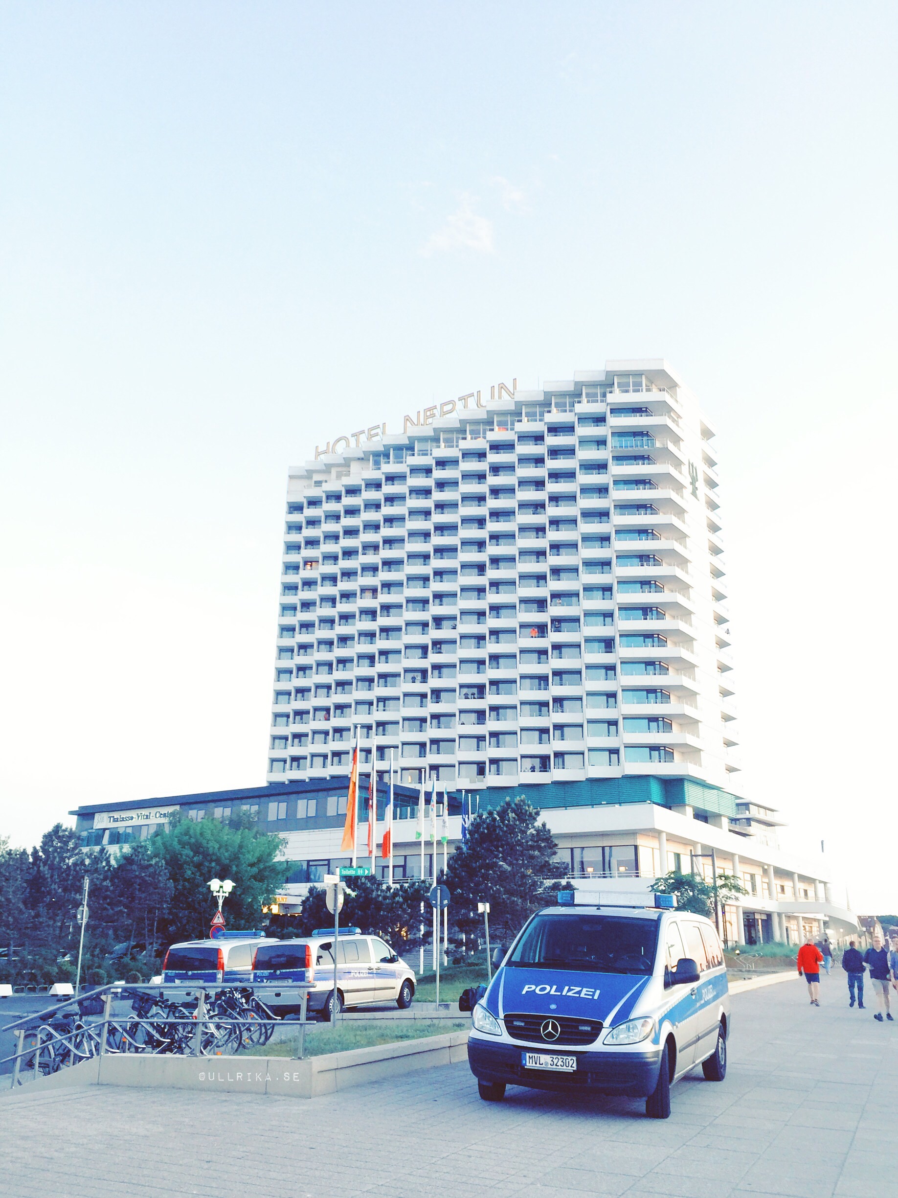 När vi promenerade där på strandpromenaden i godaste ron och jag fick flashbacks och minnesbilder till 1980-tal kom plötsligt mängder av blinkande polisbilar farande (civila bilar också) å fem minuter senare körde de lika fort åt andra hållet. När tre gendermer i storlek längd och muskelmassa XXL ångade fram i 4:10-tempo mot oss som pansarvagnar kände jag att det var läge för hotellrum.