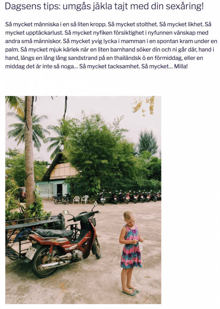 Jag drömmer mig tillbaka och glömmer regnet och kylan och insektsbetten som översvämmade oss när vinden äntligen mojnade och solen började värma. Jag minns bara värmen och lugnet. Jag glömmer duschscenen vi hade sexåringen och jag, där grannarna oroligt undrade för bungalowväggar är tunna, men vi blev vänner både sexåringen grannarna och jag och jag minns bara ljumma kvällar och glass och en immig flaska söt öl och promenader i strandbrynet och en flytartävling i lent knappt svalkande hav som förresten fortfarande inte är slut för efter en evighet begärde vi båda time out. Jag minns stekheta ödsliga betongvägar och surrande elledningar och sen blir det skymning och jättesnabbt natt och en liten varm hand i min och cikadors sång fyller det ljuvligt smekande mörkret och vågornas sus mot stranden som du hör när det blir alldeles tyst och sen somna mellan svala lakan bredvid en liten mjuk människa som du älskar mer än det går att förstå. Och sen börjar det om igen. En vardag utan tidtabell och andra beslut än om vi ska bada eller läsa bok och var vi ska äta kvällsmat. Det är kanske inte så konstigt att det där är en dröm. Fast en sanndröm och ett minne jag vårdar ömt. Älskade Milla. Och älskade Mattias och EmmaLi som lät oss få det där tillsammans ♡