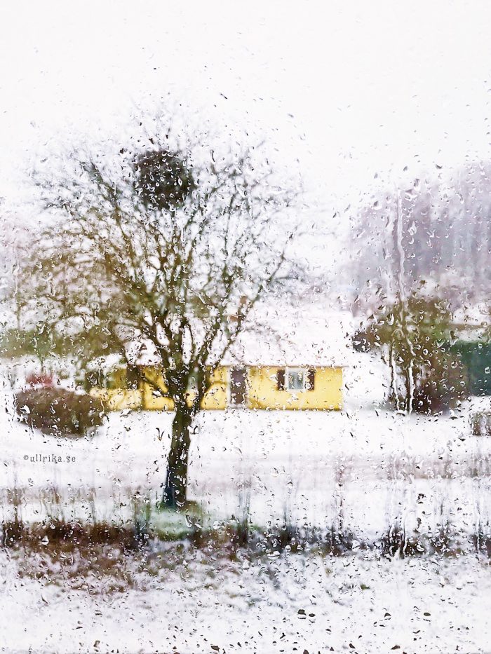 Blött, vääldigt blött, men vitt så jag anar det skulle kunna vara en kusin till snö som idag virvlat in över nordmellersta Halland. På lunchen såg det ut såhär utanför fönstret…