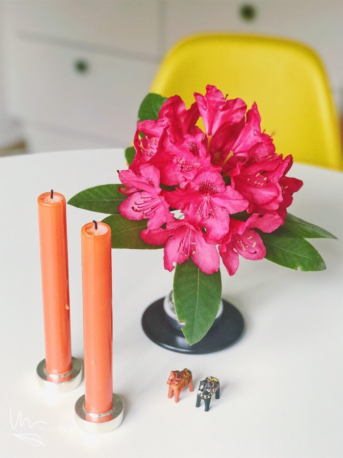 Lättar upp med en rhododendron från får överblöta trädgård. Allt regn har gjort växtligheten pigg men sen trött och den ena busken är redan på väg att tappa sina blommor. Detsamma gäller syrenen som i år blommat helt galet mycket men som nu, efter bara några dagar nu fått se sina blommor bortregnade. De ligger som en rest av svunnen tid på gräsmattan nedanför. Lite sorgligt såklart, men vackert det också – så länge en låter bli att titta uppåt busken till. Guldregnet är illgult och växer så det knakar. Nederbördseffekten tänker jag, och grubblar på när ett sådant träd ska beskäras?