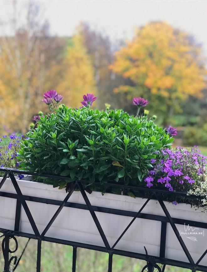 Blommorna på balkongen är piggare än typ nånsin och vi har inte hjärta att slänga dom. Men lådan är tung av allt regnande så vi måste hålla koll så den inte rasar i gräsmattan under.