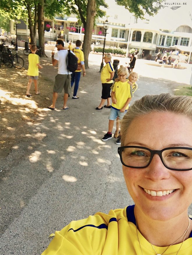NĂ€stan direkt efter att Ă„ttondelsfinalen mot Schweiz blĂ„ses av i tisdags kvĂ€ll ringde jag SocietĂ©n och bokade platser pĂ„ parkett framför kvartsfinalen. Det Ă€r flera krogar i stan som visar matcherna, varav Ă„tminstone tvĂ„ pĂ„ utomhus-skĂ€rmar, men eftersom vi jobbade till klockan tre hade vi ju inte möjlighet att vara pĂ„ plats förrĂ€n tidigast halv fyra. Med avspark kl fyra ville vi vĂ€lja ett stĂ€lle dĂ€r vi kunde boka bra platser som skulle vĂ€nta pĂ„ oss utan att riskera hamna utan sikt mot TVn. Extra skojigt var att vi fick med min mamma och en annan familj sĂ„ vi var ett litet glatt sĂ€llskap som traskade ner frĂ„n torget efter stĂ€ngning! Kan vĂ€l erkĂ€nna att jag bad mamma vrida om lĂ„set pĂ„ dörren nĂ„gra minuter innan tre – och dĂ„ hade vi inte haft kunder pĂ„ tio minuter 🙂