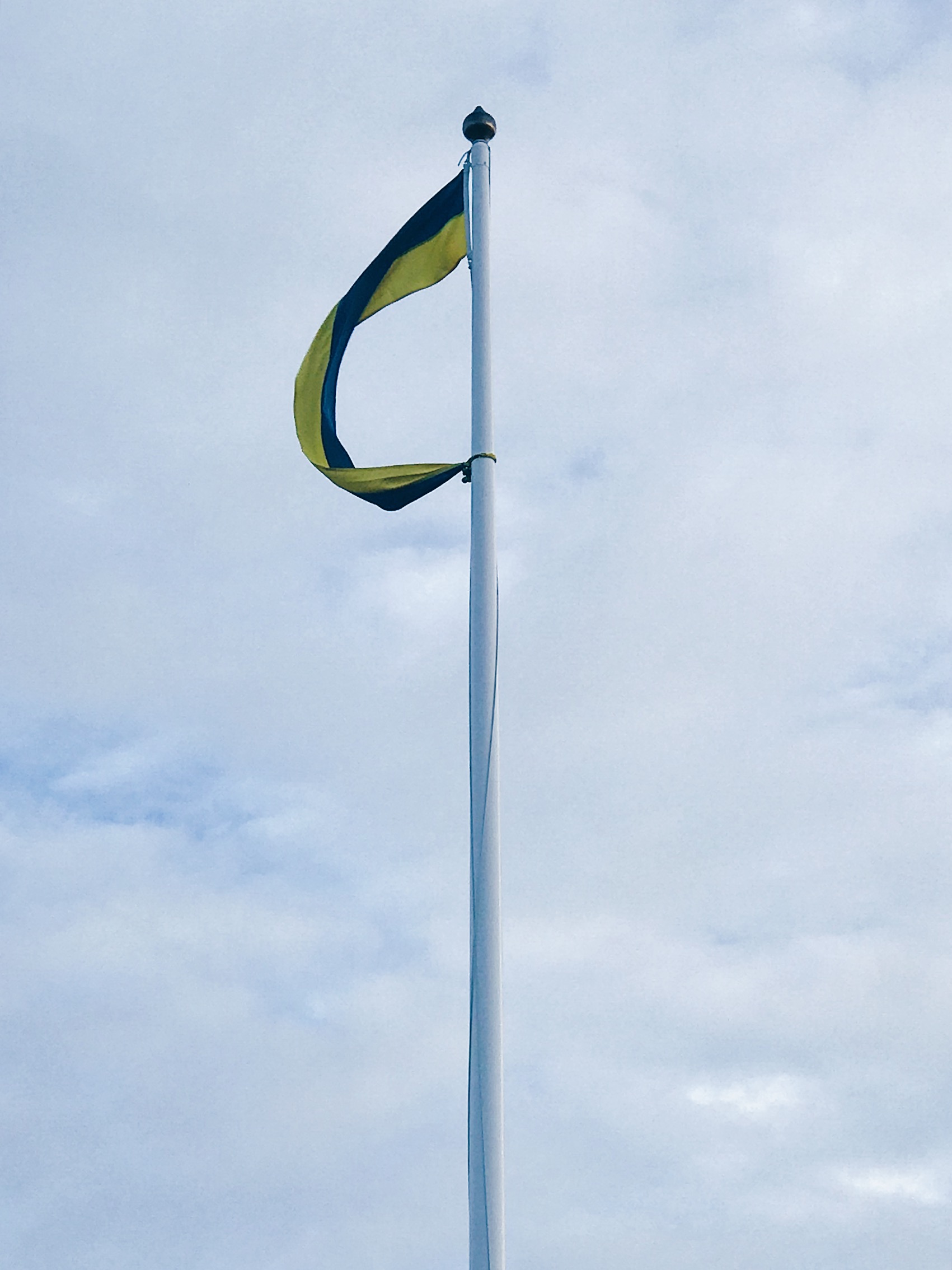 En flaggstång bör aldrig vara naken, resonerar vi, men när vimpeln snurrat ihop sig så till den milda grad att den gjort hårda knutar inte bara på sig själv – vilket det ju lätt blir i tiotal ungefär direkt i en så blåsig landsända som vår – utan också runt själva stången och därmed inte går att hissa ner, då blir det till att hala hela stången istället!