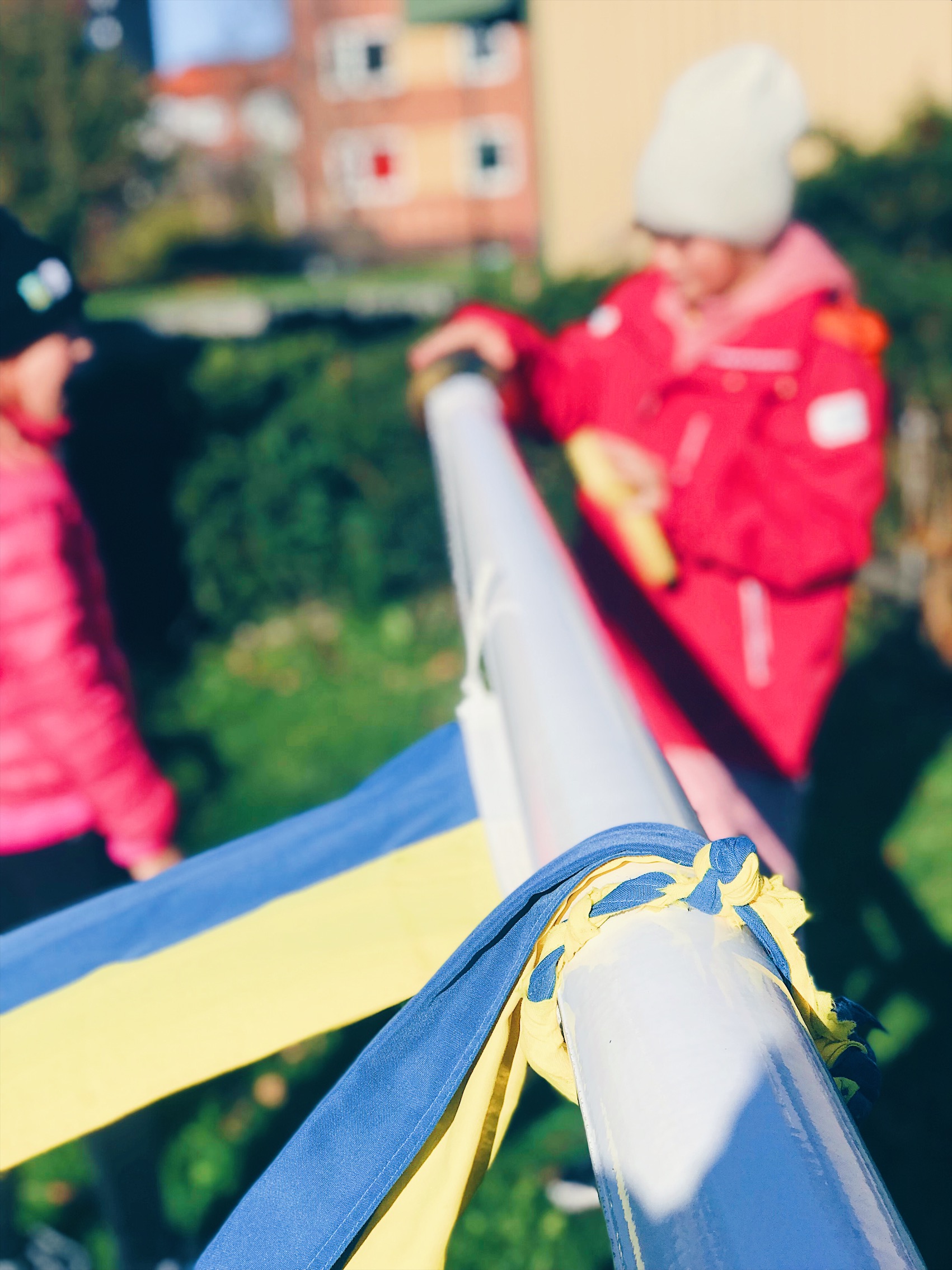 Jag tycker det var ganska sniggt med vimpeln i en båge, men när ni nu gjort er besvär med städning och avknutning kan ni ju över vintern hissa ljusslinga i snirklar runt stången, så den ser ut som en väldigt smal minaret under Ramadan?