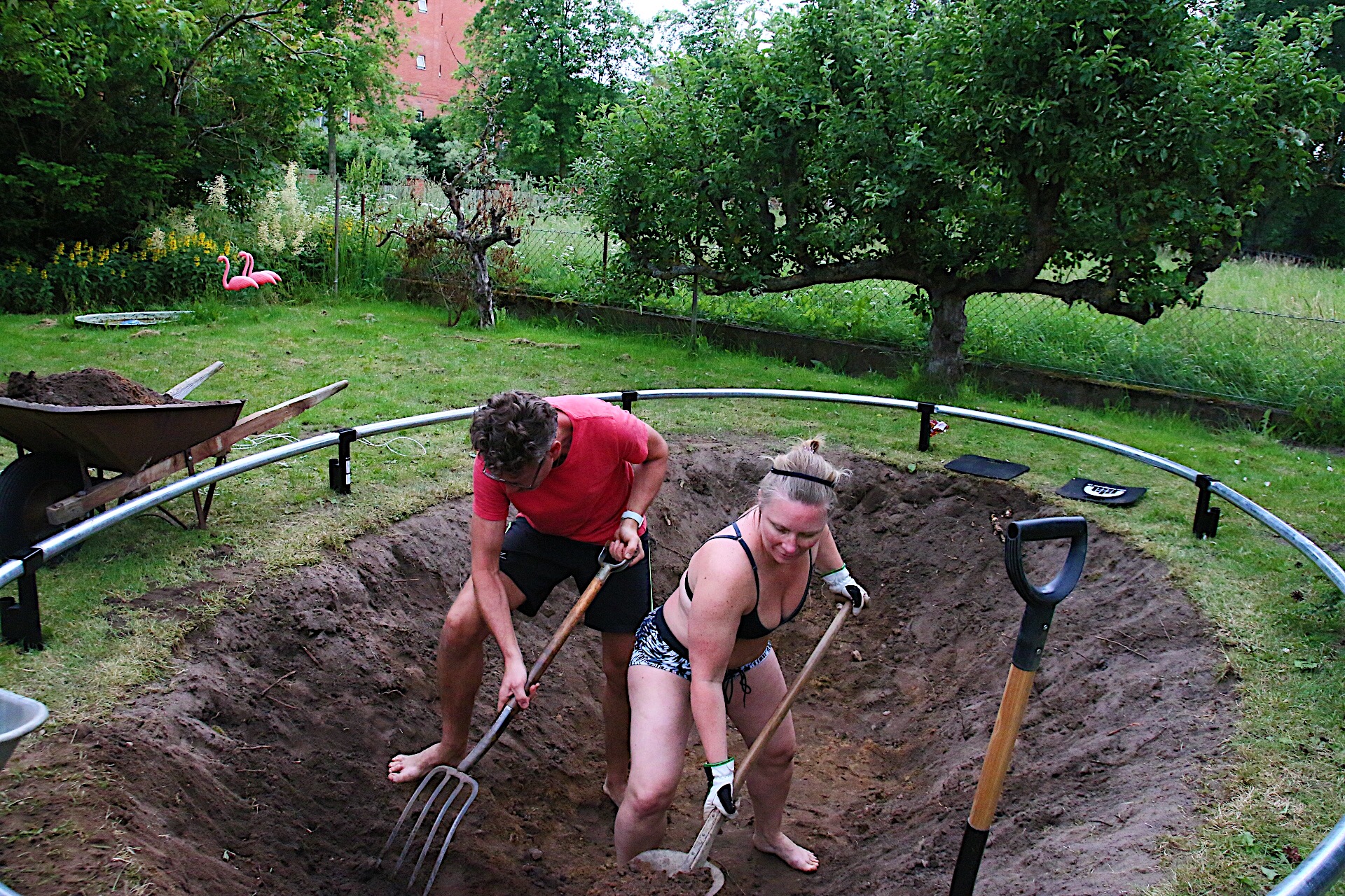 EmmaLi var helt fantastisk och satte fart som om hon inte hade några muskler. Att ha ont i alltså. Muskler har hon ju bevisligen. Precis som humor. Även om just den sistnämnda var ändå smått svårmottaglig där vi står i knädjup studsgrop och hör henne säga: “Mamma? Så himla roligt sen när firman du köpte studsmattan av ringer och frågar när dom ska skicka över grävmaskinen som ingick på köpet!”… *kort paus* Mattias och jag funderade på om vi skulle gapskratta eller ångra att vi närt ett så ironiskt barn vid vår barm. Vi gapskrattade. Och grävde vidare.