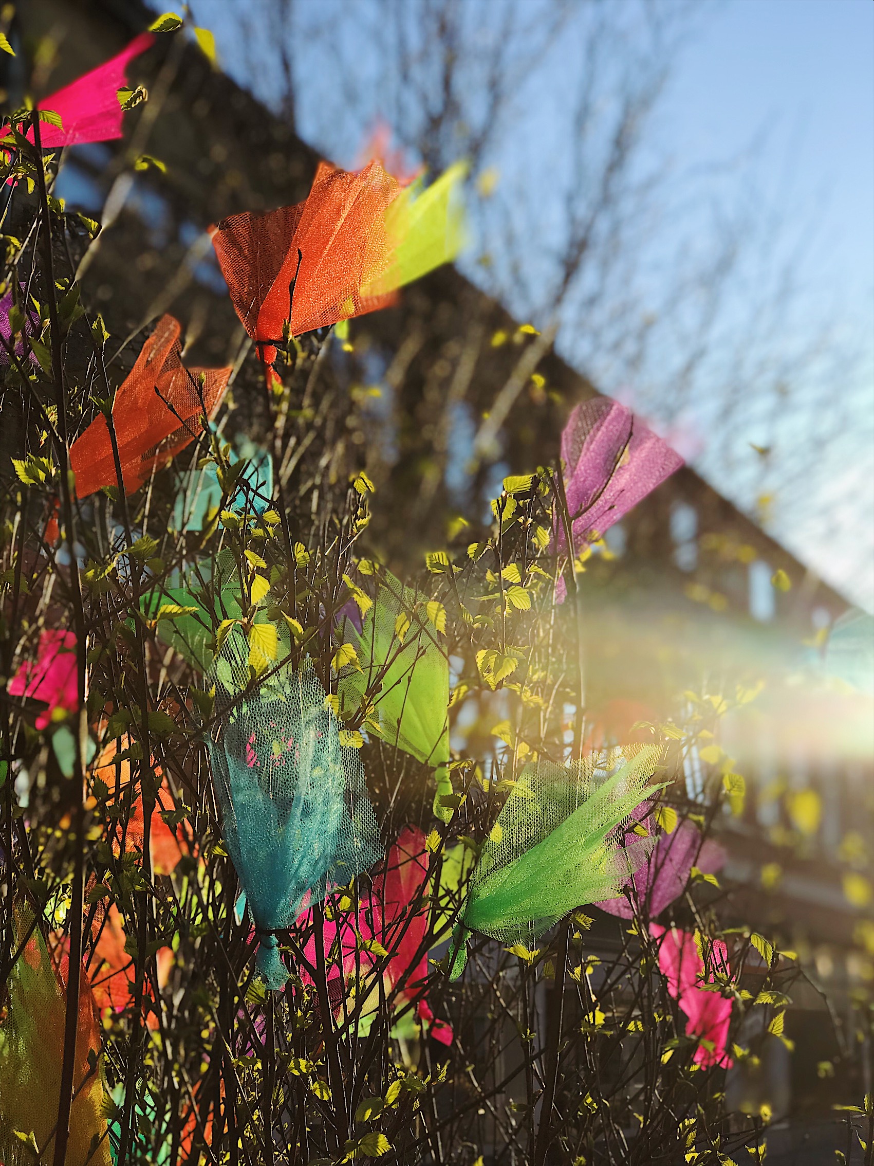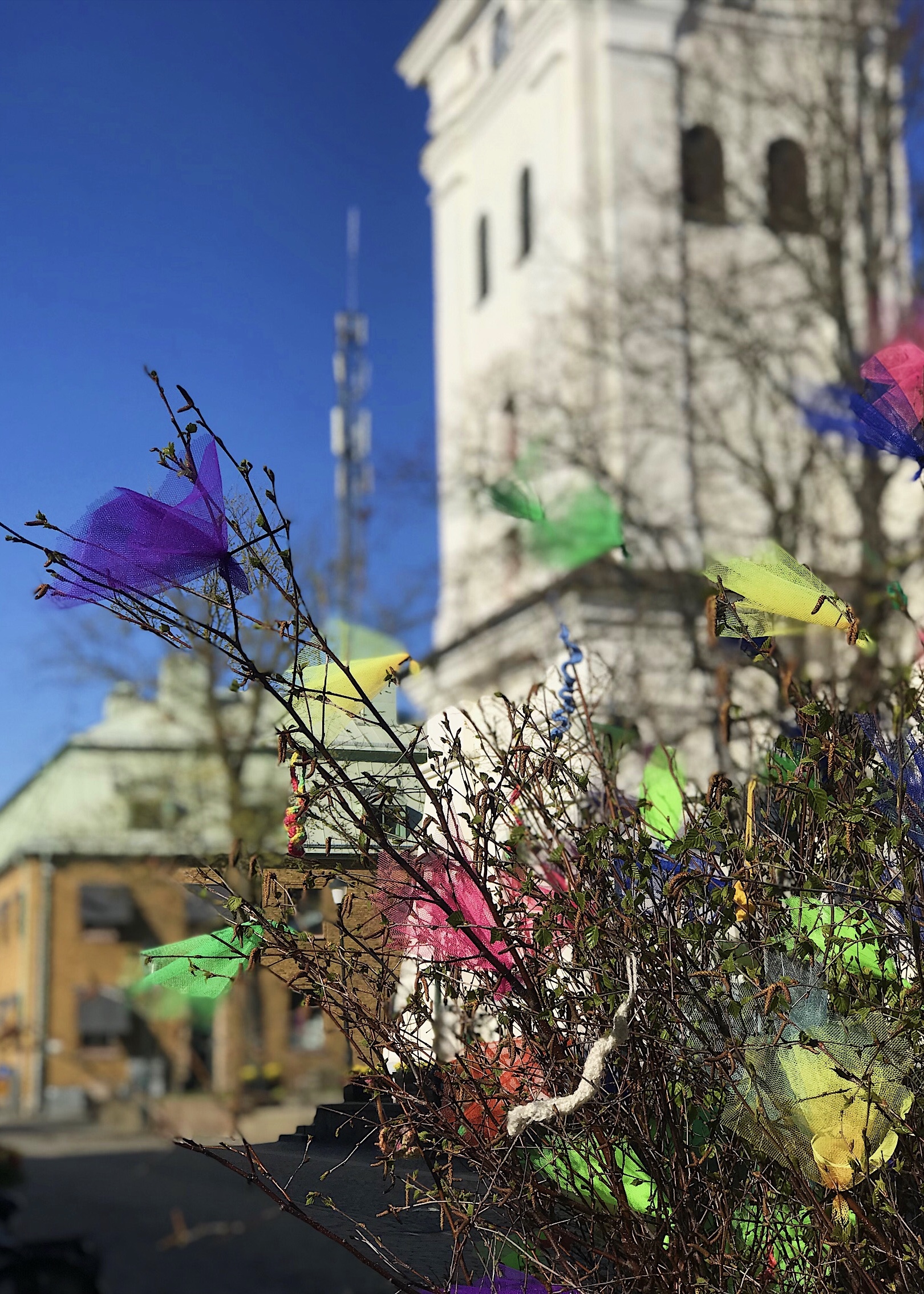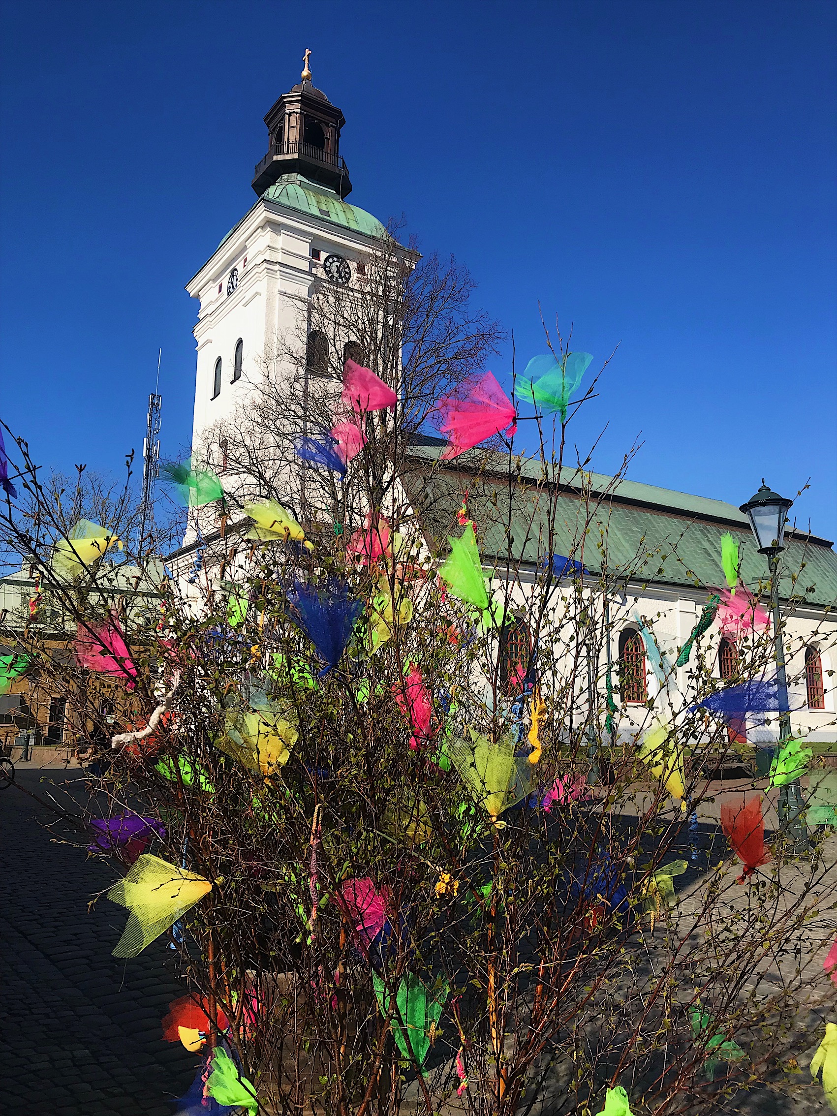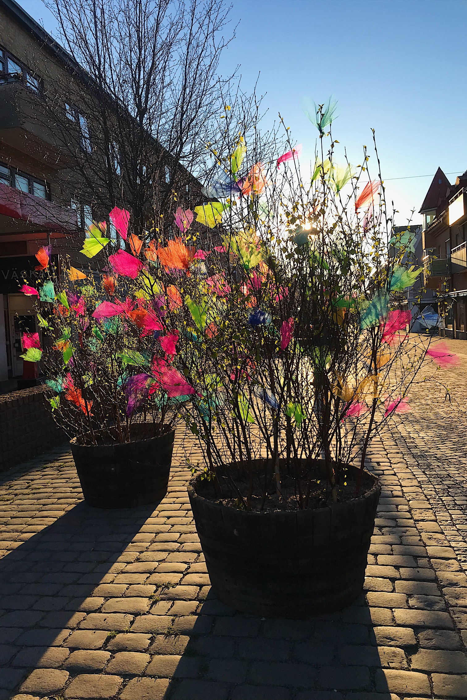 Fjädrar i påskris får ris. Ros därför till Varbergs Kommun som i år igen pyntat med nån form av trassel. Stor färgglad ros också till Hamn- och Gatuförvaltningen som håller planteringar och mobil utsmyckning så himla fint här i stan!