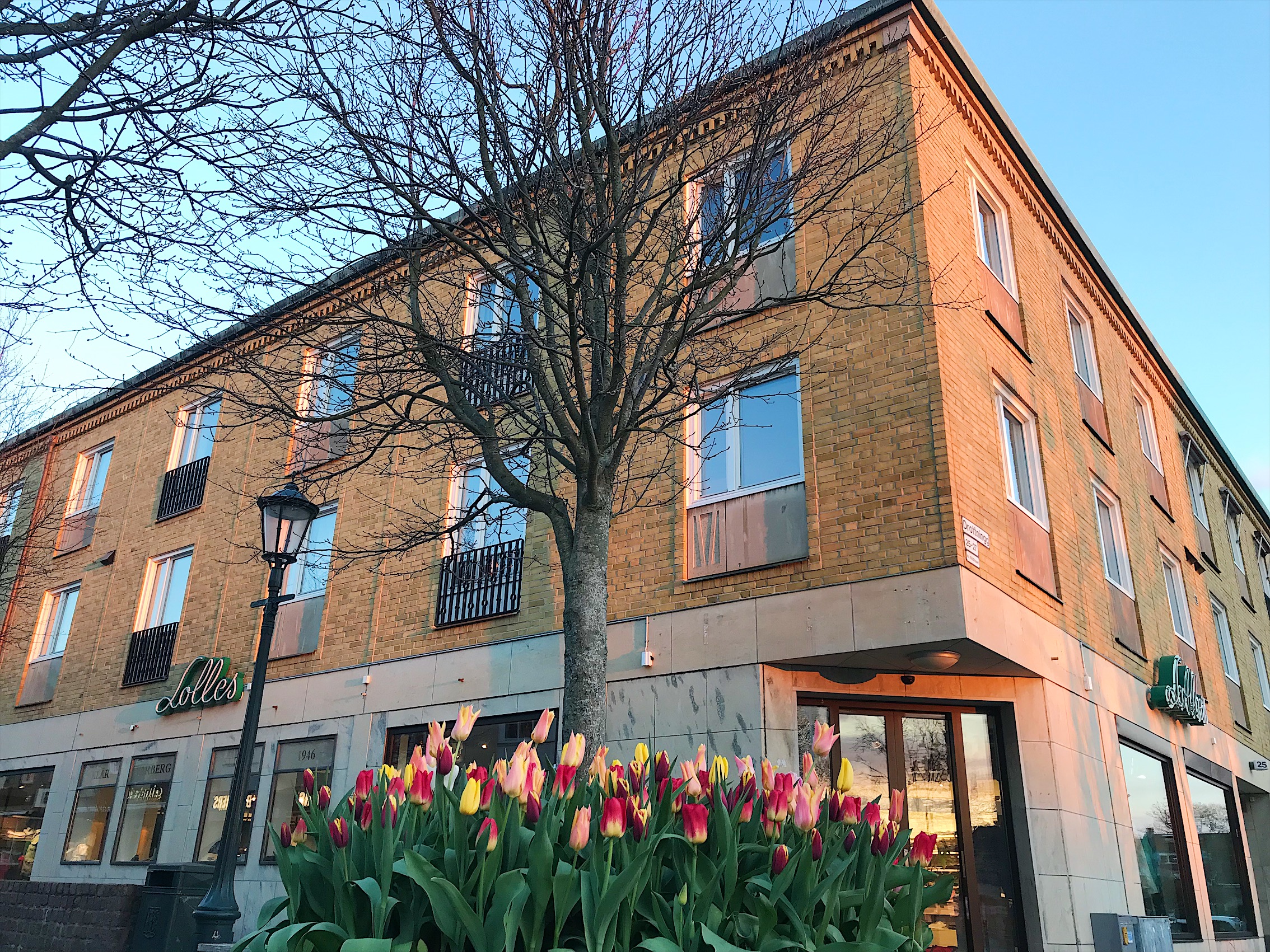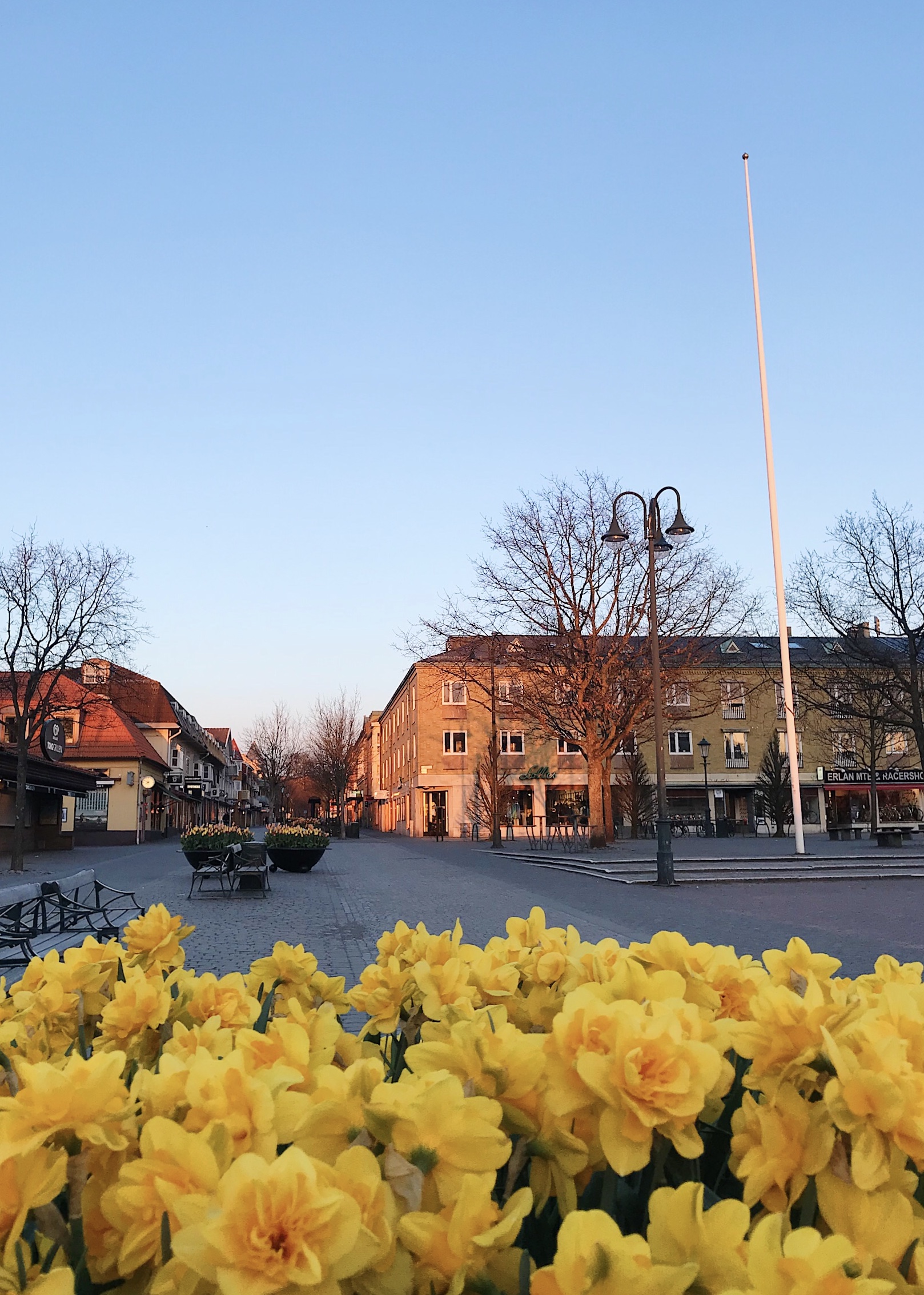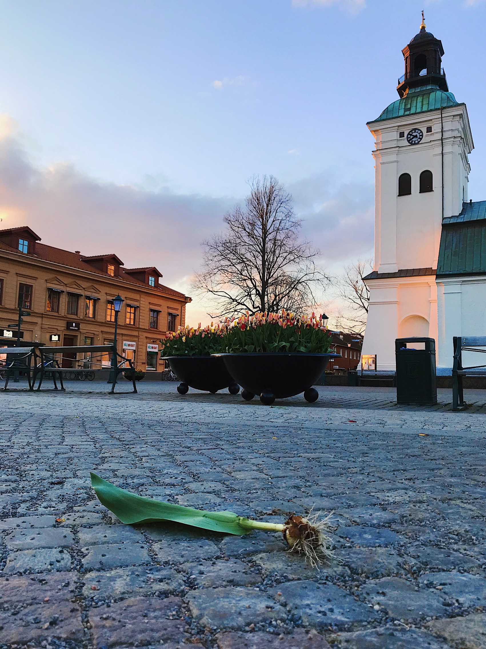 Torget var vackert smyckat redan före påskpyntet. Först en underbar liten sjö av tulpaner precis utanför vår butik, i mitten ett foto österut från torget med påskliljor i mängd och till höger ett bevis på att folk inte alltid kan hantera sig själva… pinsamt och sorgligt beteende, och helt obegripligt?